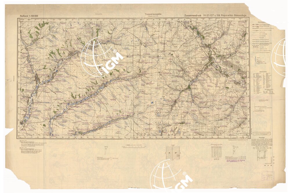 RUSSIA – RUSSISCHE KARTE (RIPRODUZIONE TEDESCA DELLA CARTA ORIGINALE DELLO S.M. DELL’ESERCITO ROSSO) Foglio M-37-107 Popowka, Foglio M-37-108 Bokowskaja