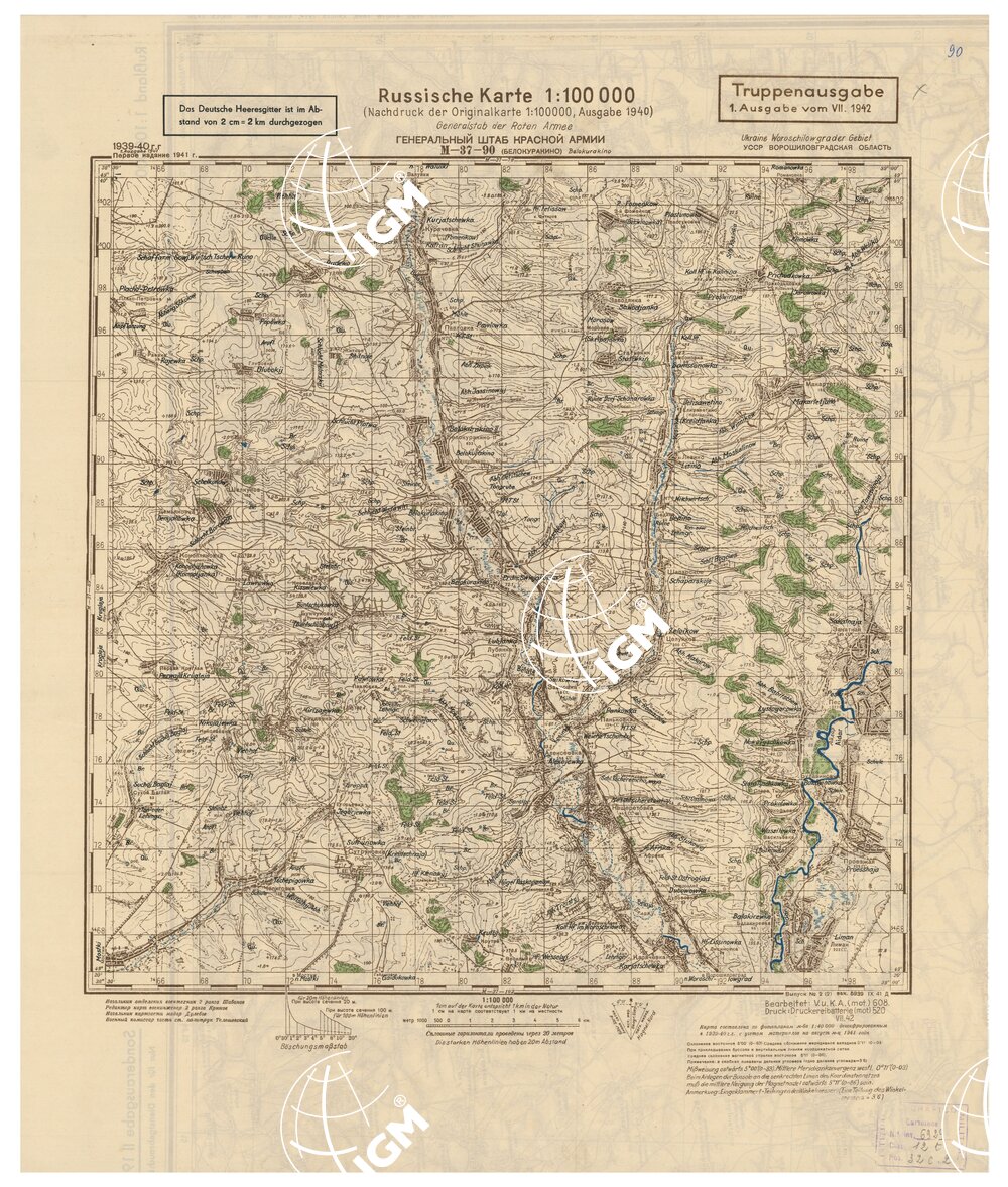 Fogli 49 Tipo di stampa in bistro con boschi ed acque – rappresentazione orografica a curve di livello grafica russa e tedesca.