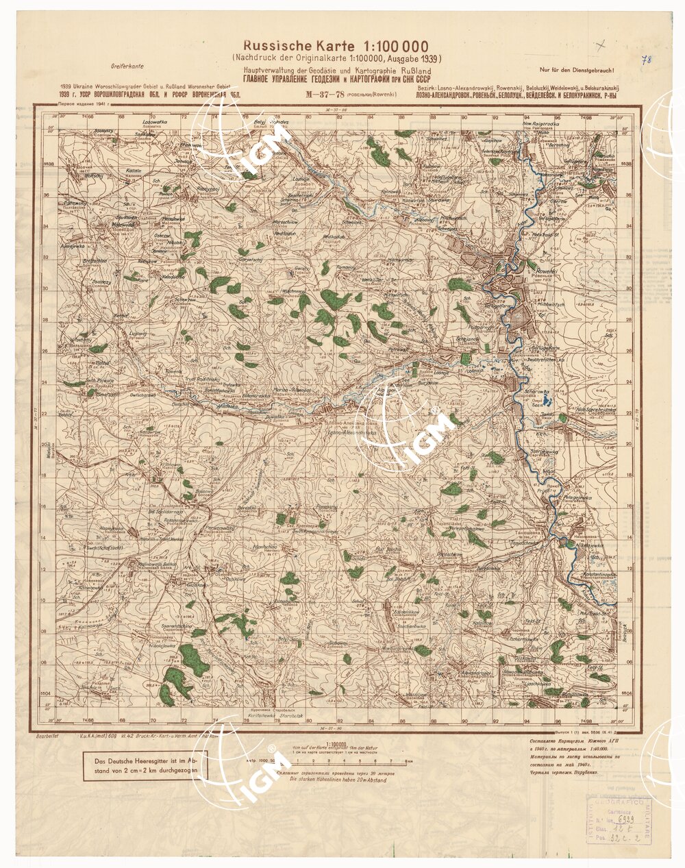Fogli 49 Tipo di stampa in bistro con boschi ed acque – rappresentazione orografica a curve di livello grafica russa e tedesca.