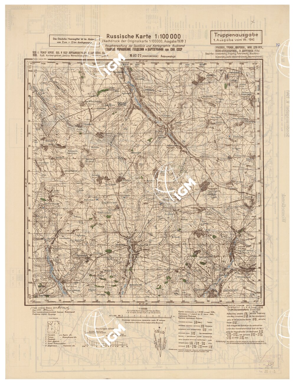 Fogli 49 Tipo di stampa in bistro con boschi ed acque – rappresentazione orografica a curve di livello grafica russa e tedesca.