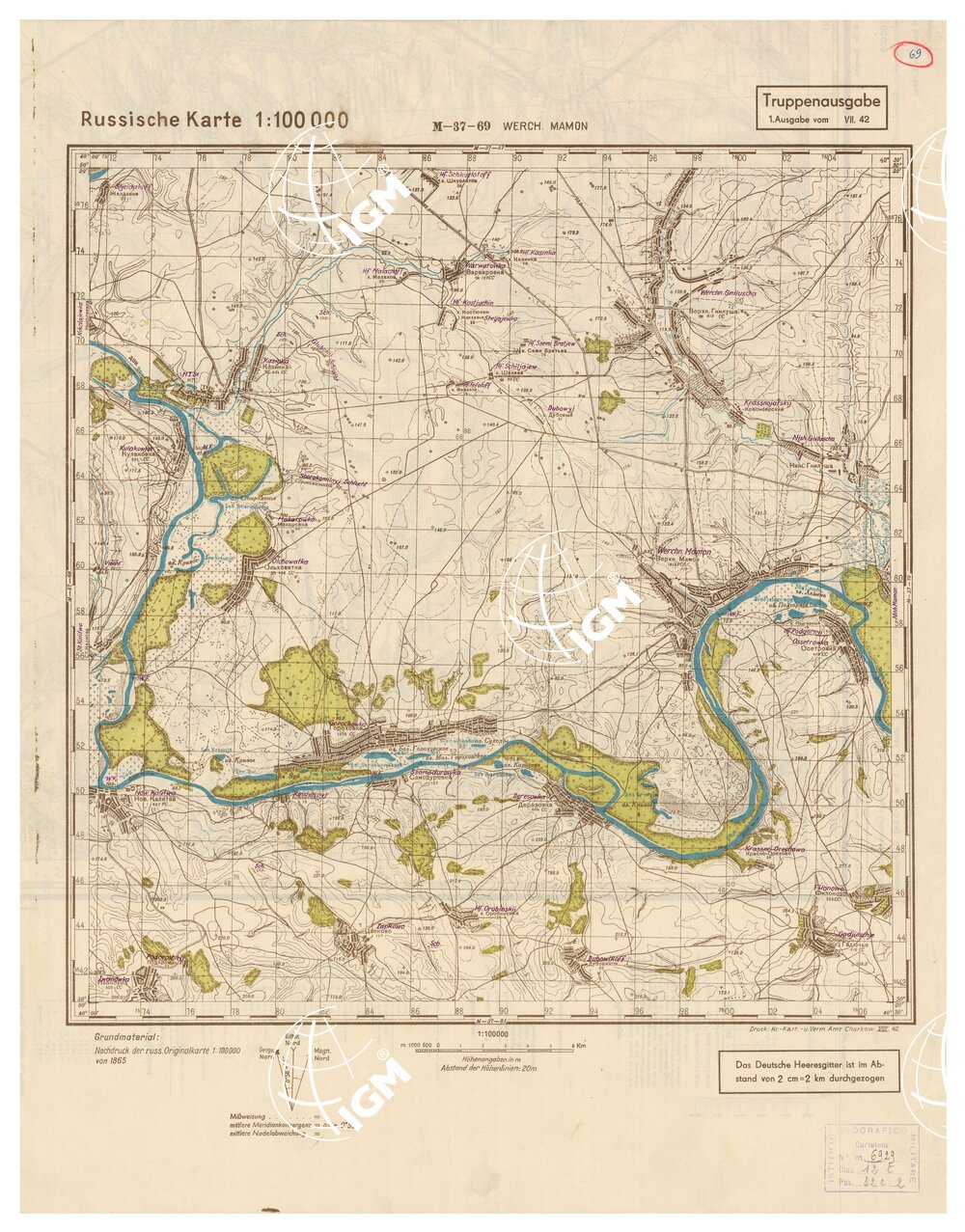 Fogli 49 Tipo di stampa in bistro con boschi ed acque – rappresentazione orografica a curve di livello grafica russa e tedesca.
