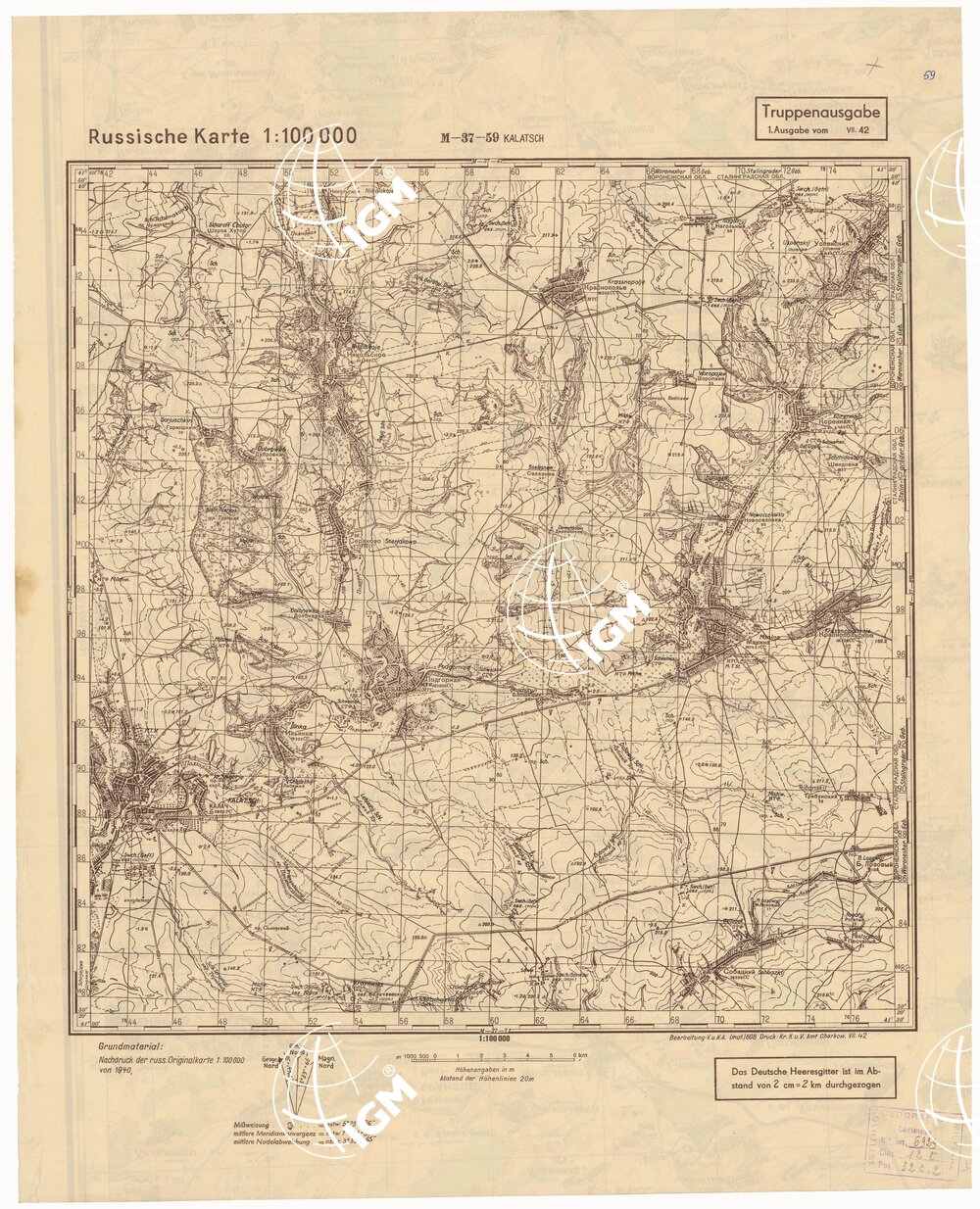 Fogli 49 Tipo di stampa in bistro con boschi ed acque – rappresentazione orografica a curve di livello grafica russa e tedesca.