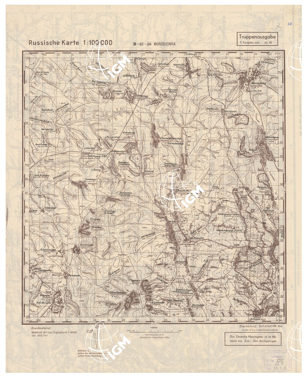 Fogli 49 Tipo di stampa in bistro con boschi ed acque – rappresentazione orografica a curve di livello grafica russa e tedesca.