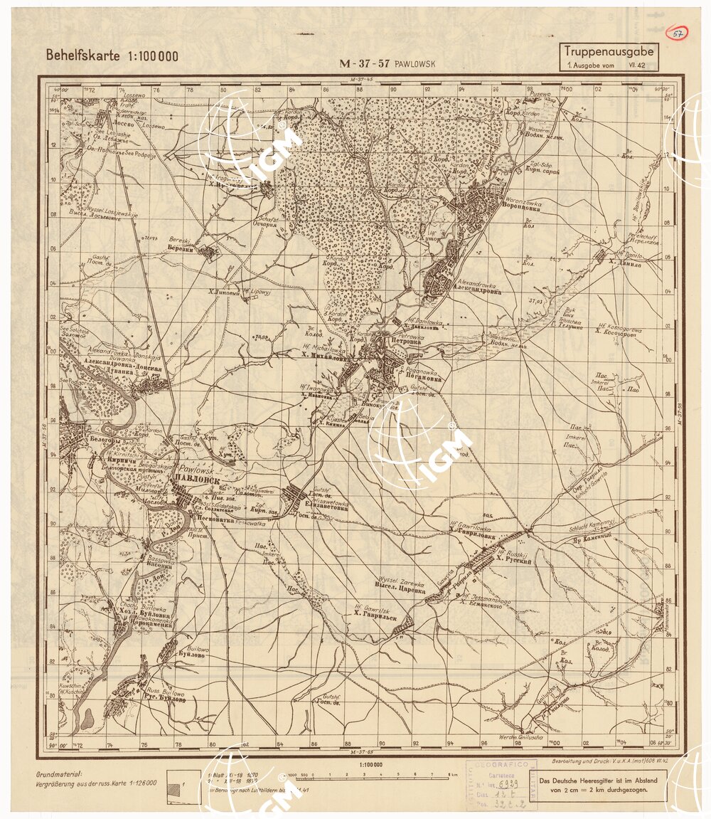 Fogli 49 Tipo di stampa in bistro con boschi ed acque – rappresentazione orografica a curve di livello grafica russa e tedesca.