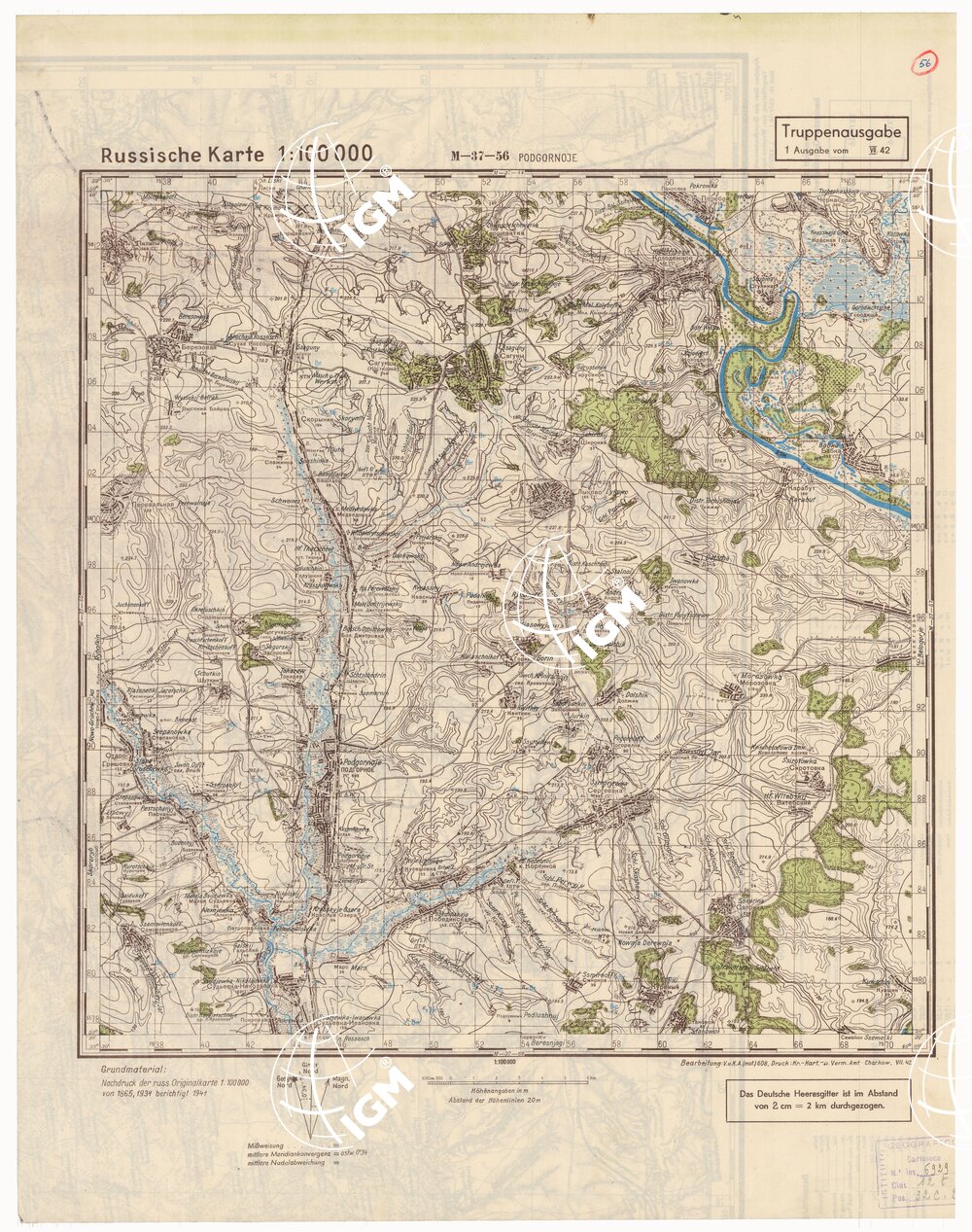 Fogli 49 Tipo di stampa in bistro con boschi ed acque – rappresentazione orografica a curve di livello grafica russa e tedesca.