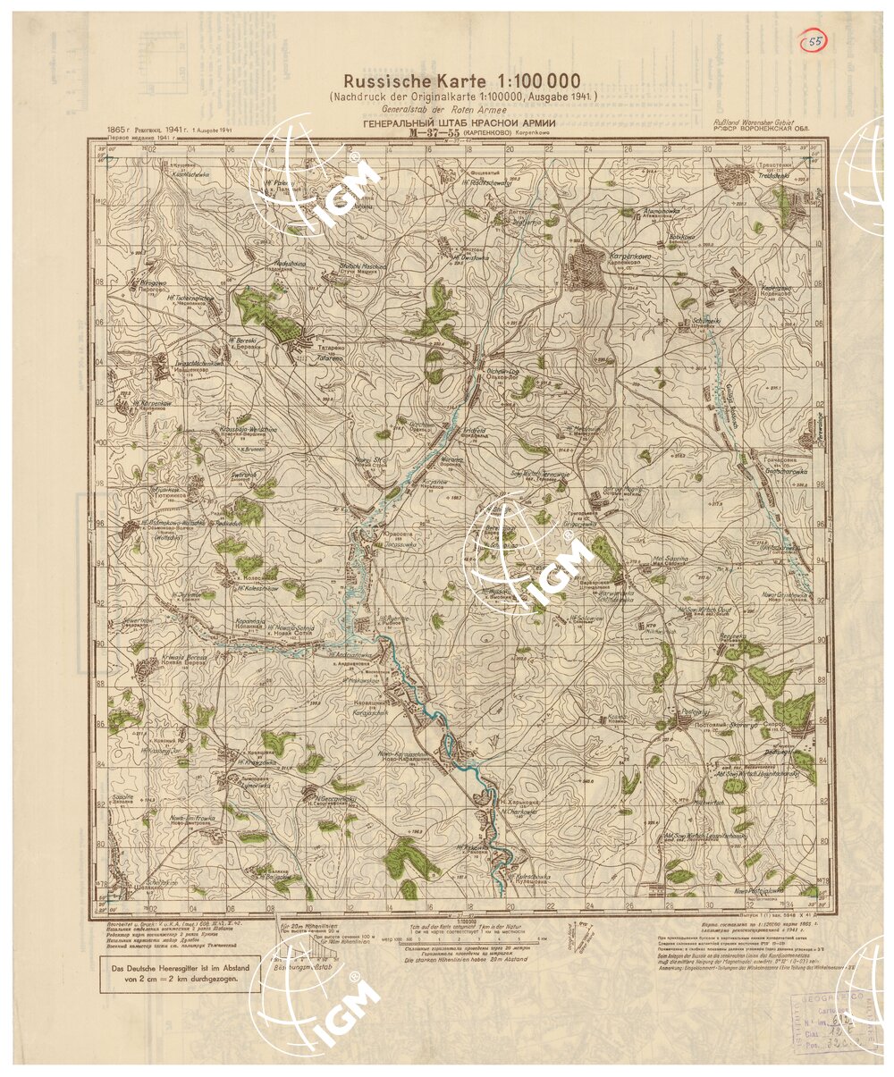 Fogli 49 Tipo di stampa in bistro con boschi ed acque – rappresentazione orografica a curve di livello grafica russa e tedesca.