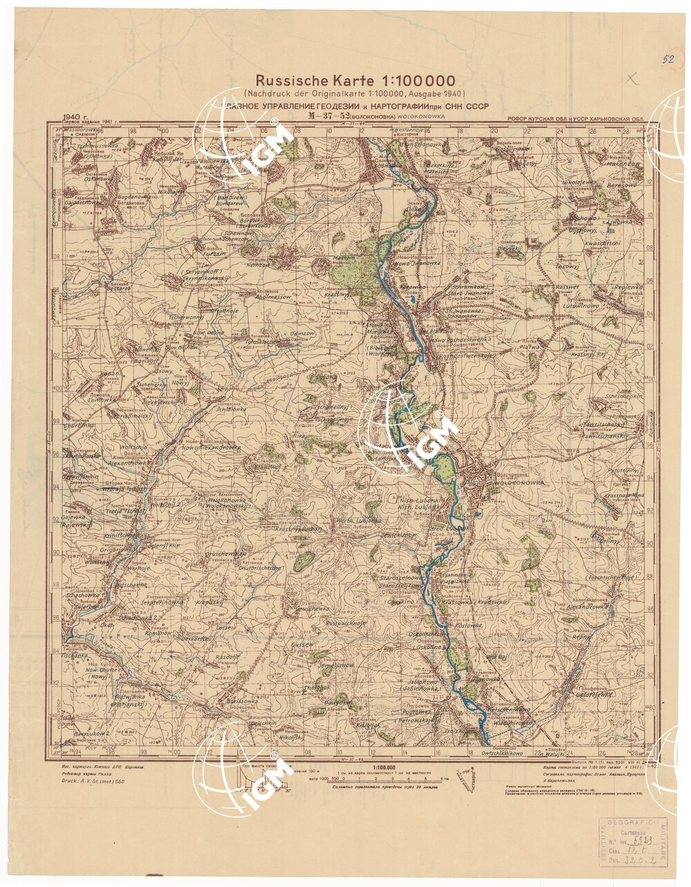 Fogli 49 Tipo di stampa in bistro con boschi ed acque – rappresentazione orografica a curve di livello grafica russa e tedesca.