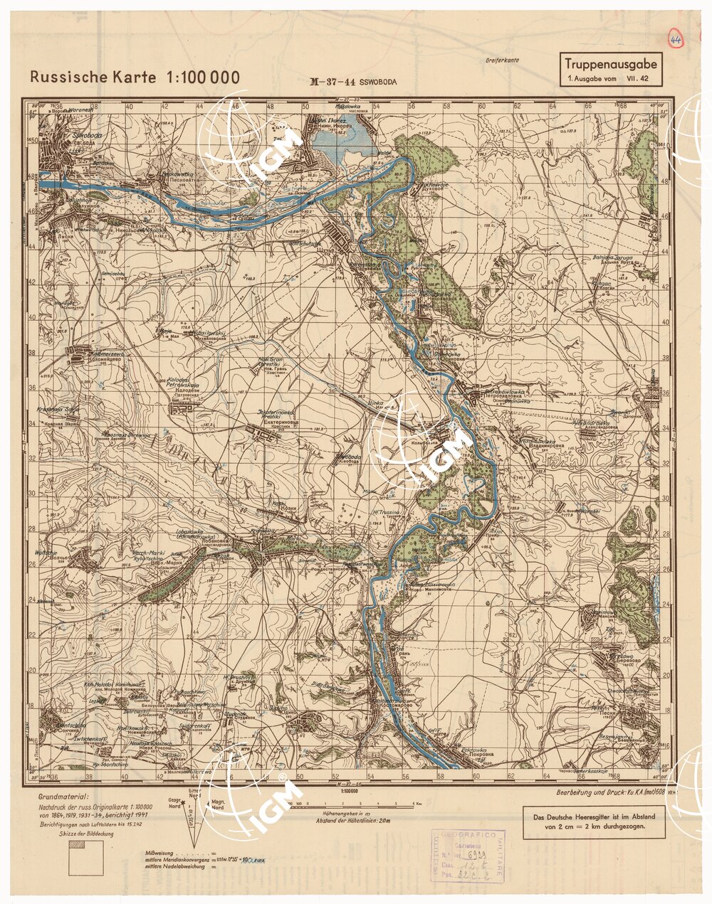 Fogli 49 Tipo di stampa in bistro con boschi ed acque – rappresentazione orografica a curve di livello grafica russa e tedesca.
