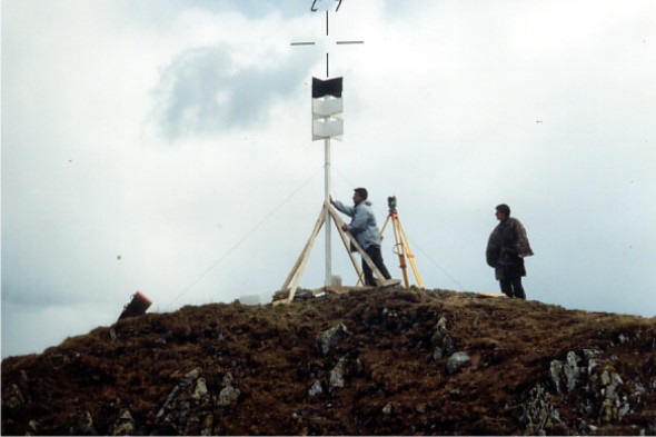 Centrino di superficie in blocco di cls. prefabbricato con sottostante centrino di fondo coassiale cementati separatamente con getti di cls. Riferimenti: R1, R2, R3 croci incise su roccia.