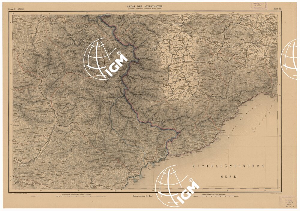 Fogli 12 – Tipo di stampa: in nero colorata a mano, rappresentazione orografica a tratteggio.