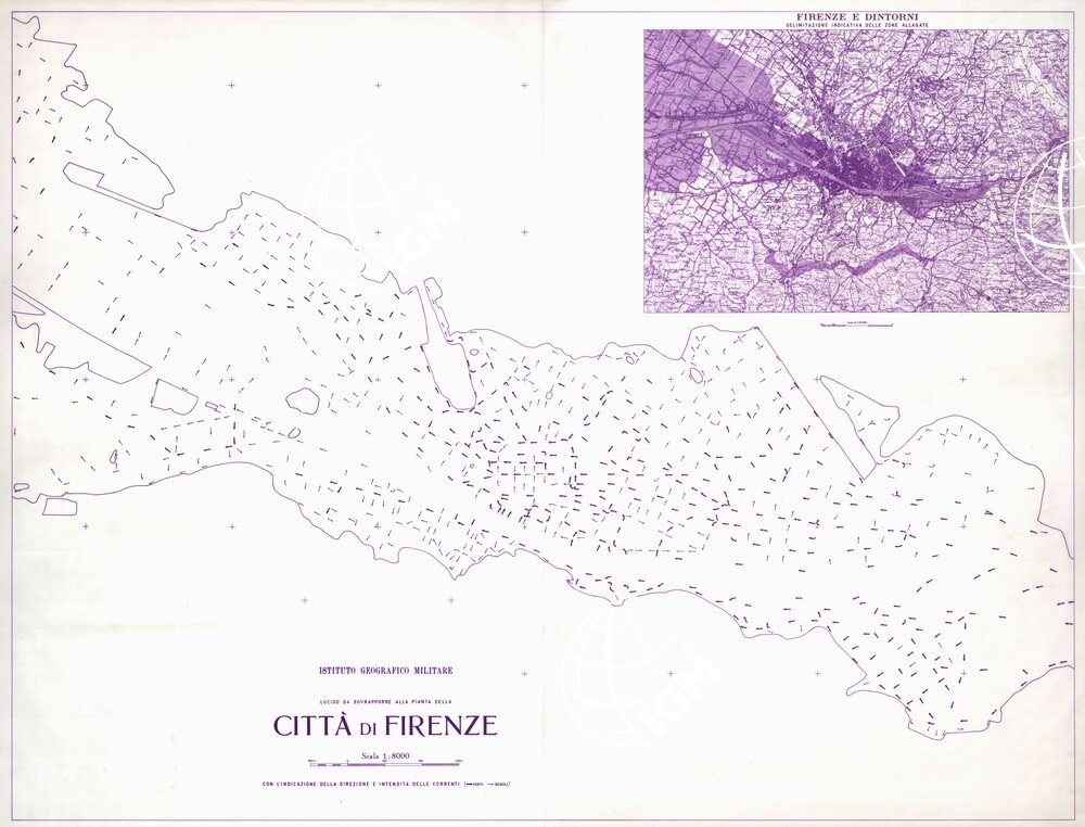 Lucido da sovrapporre alla carta ( file SE007110 ) riporta la direzione e l’ intensità delle correnti e un riquadro alla scala di 1:50.000 indicante la delimitazione delle zone allagate nei dintorni di Firenze.