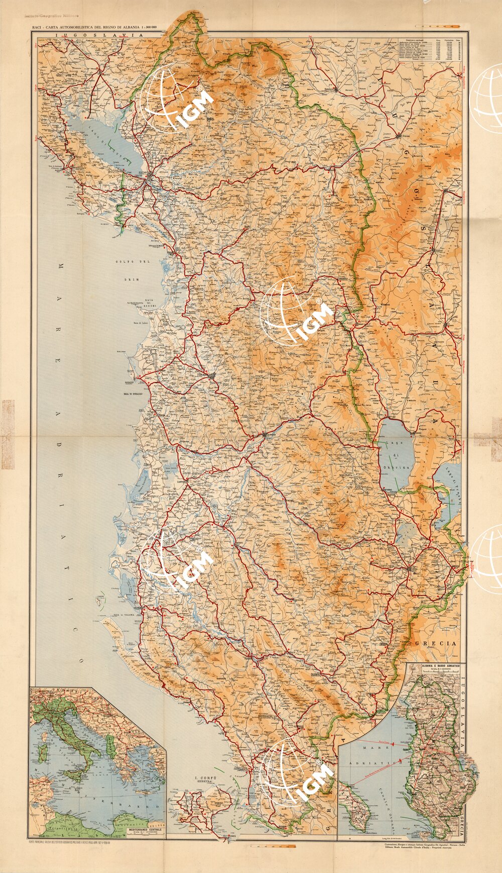 Carta realizzata dall’ Istituto Geografico De Agostini dai rilievi dell’ IGM del 1927 – 1938 edita per conto del Reale Circolo Automobile d’ Italia ( R.A.C.I. ) vi sono inseriti 2 riquadri con carte del Mediterraneo centrale alla scala di 1:10.000.000 e dell’ Albania e basso Adriatico alla scala di 1:1.500.000