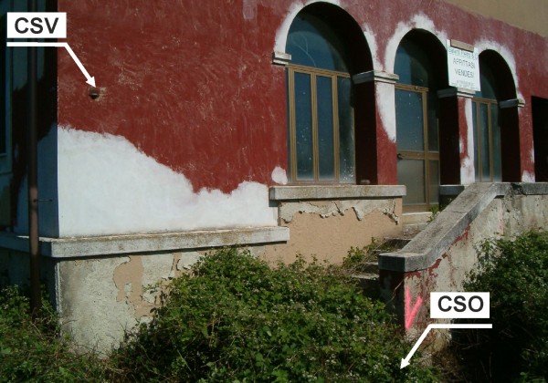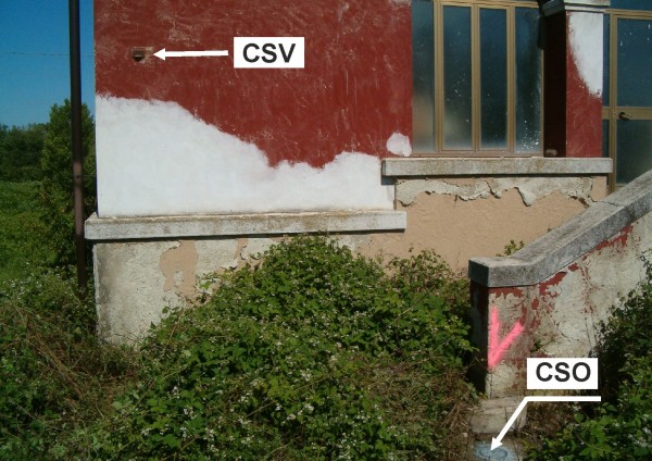 | Contrassegni | [{"simbolo_contrassegno":"P3","materializzazione":"(CSO) – Chiusino in ghisa posto alla base del muro delle scale lato sinistro."},{"simbolo_contrassegno":"V1","materializzazione":"(CSV) – Mensola infissa nella facciata, che d\u00e0 sulla statale, della ex casa cantoniera presso lo spigolo di sinistra."}] |