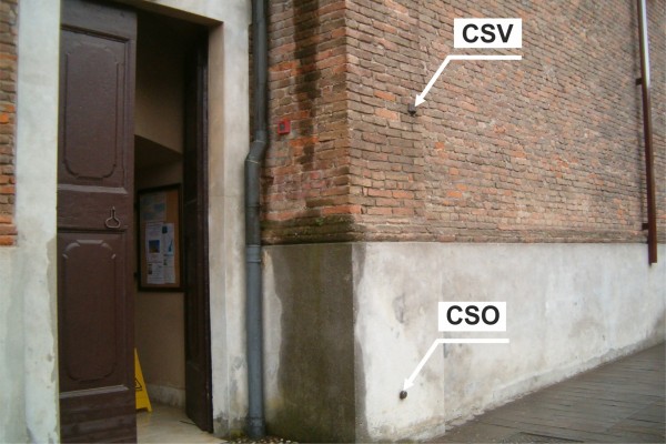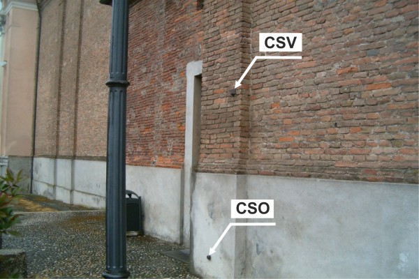 [{"simbolo_contrassegno":"B1","materializzazione":"(CSO) – Bullone infisso nella parete laterale destra su di un pilastro a destra dell'ingresso laterale alla chiesa."},{"simbolo_contrassegno":"V1","materializzazione":"(CSV) – Mensola infissa in corrispondenza del CSO."}]