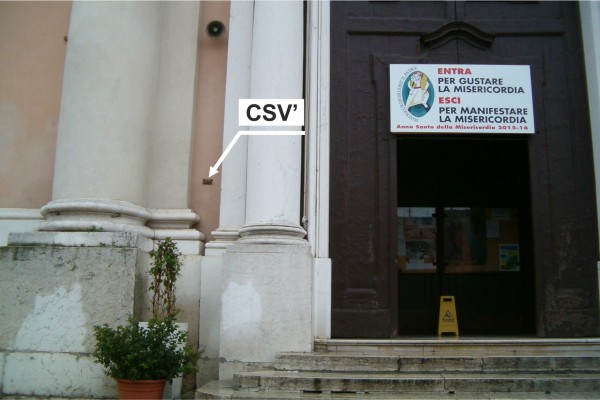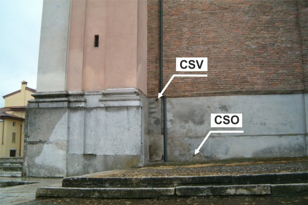 [{"simbolo_contrassegno":"B1","materializzazione":"(CSO) – Bullone infisso nella facciata laterale destra, in corrispondenza della prima risega del muro."},{"simbolo_contrassegno":"V1","materializzazione":"(CSV) – Mensola infissa in corrispondenza del CSO."},{"simbolo_contrassegno":"V3","materializzazione":"(CSV') – Piastrina antica infissa a sinistra della porta d'ingresso alla chiesa."}]