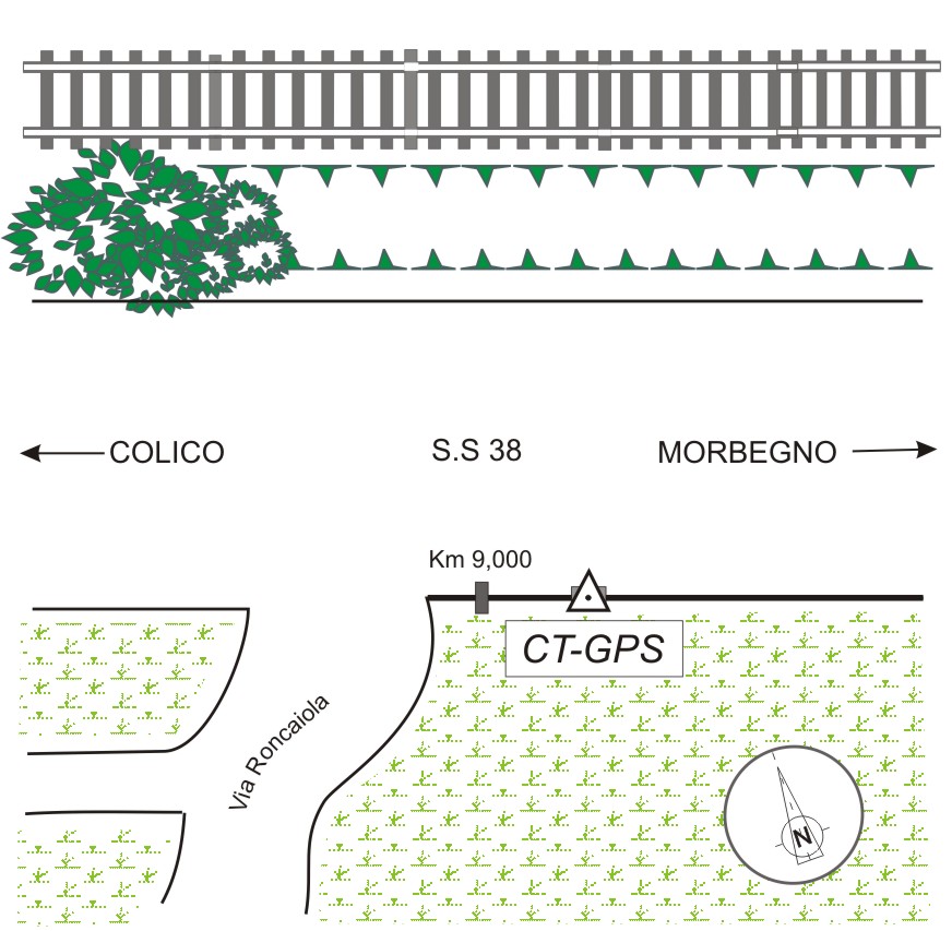 | materializzazione | Centrino in acciaio inox del tipo "GPS C", infisso sulla pietra chilometrica del Km 9,000 della S.S.38, a destra in direzione Morbegno. |