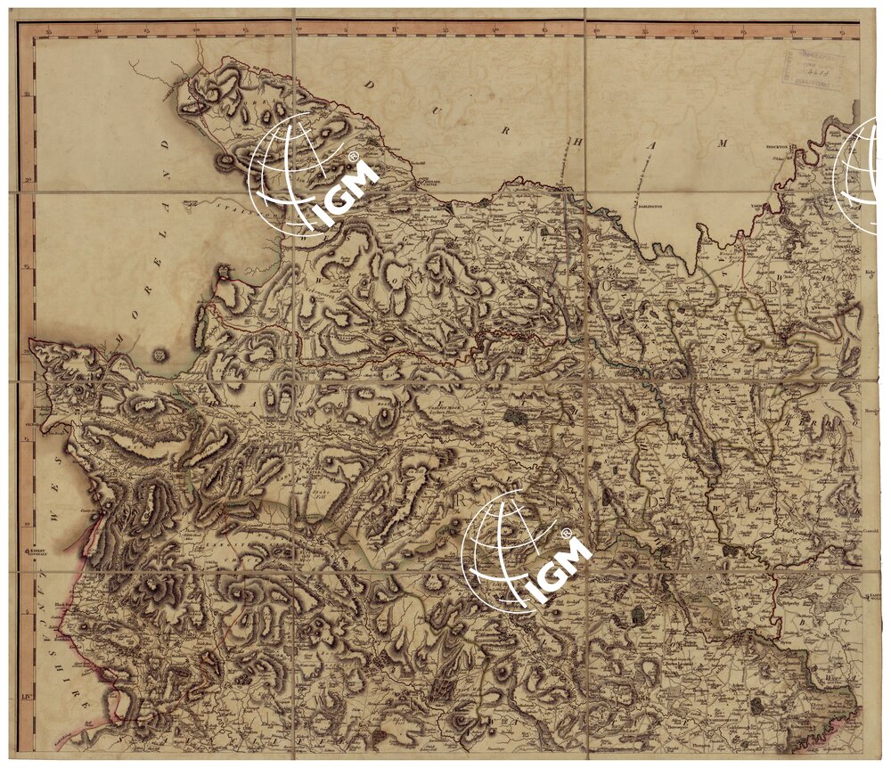 Fogli 4 (montati su tela a stacchi) inc. su rame colorata a mano rappresentazione orografica a tratteggio.