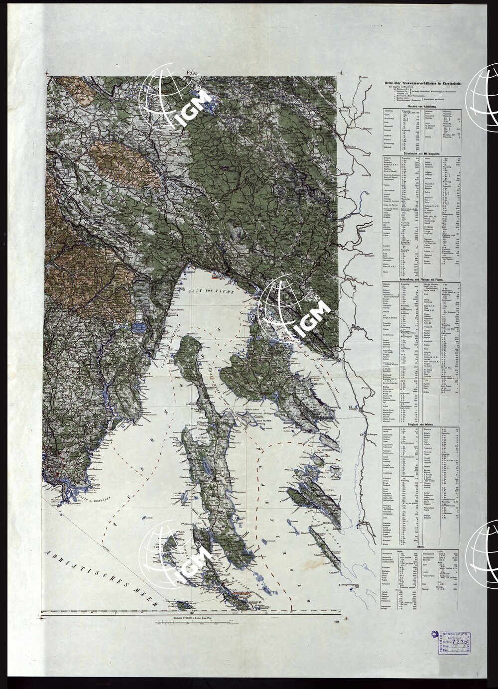 Tipo di stampa policroma, rappresentazione orografica a tratteggio, grafica in lingua tedesca.