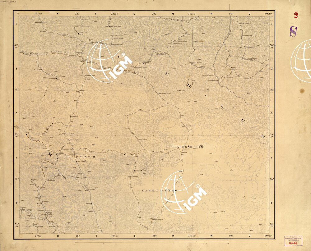 Originale disegnato a penna alla scala di 1:500.000 della planimetria e toponomastica della carta del Cashmir e regioni limitrofe alla scala di 1:750.000