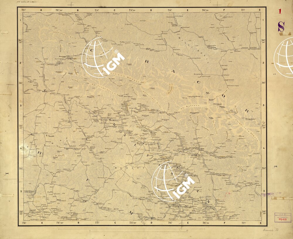 Originale disegnato a penna alla scala di 1:500.000 della planimetria e toponomastica della carta del Cashmir e regioni limitrofe alla scala di