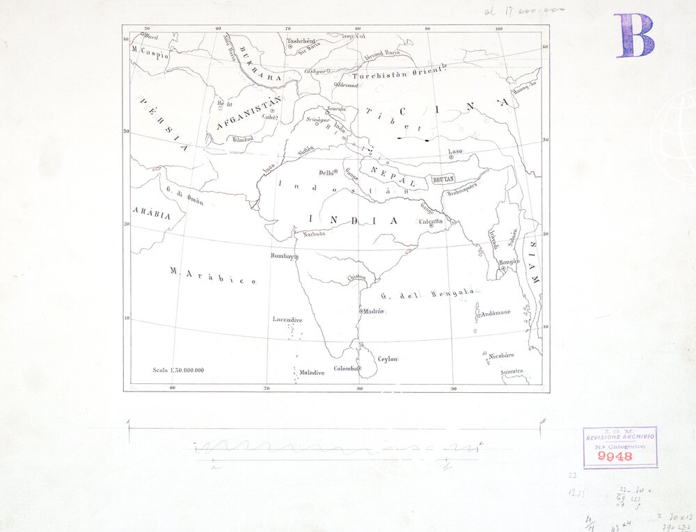 Originale disegnato a penna alla scala di 1:17.000.000 del riquadro alla scala di 1:30.000.000 presente nell’ angolo Sud-Ovest della carta.