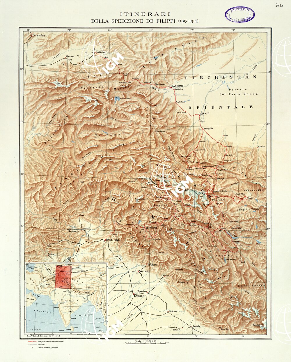 La spedizione organizzata e diretta dal Dr. F. de filippi è descritta in una collana composta da diversi volumi tematici corredati da fotografie e cartografia ( Biblioteca IGM Inventario 6806 – 6807 ) nel 1934 è stato pubblicato un ulteriore volume anche esso corredato da fotografie e cartografia che racconta in maniera più sintetica la spedizione ( Biblioteca IGM Inventario 8093 )