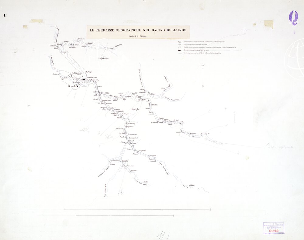 Originale disegnato a penna alla scala di 1:500.000 della toponomastica della carta delle terrazze orografiche del bacino dell’ Indo alla scala di 1:750.000
