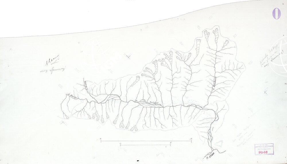 Originale disegnato a penna alla scala di 1:150.000 dell’ idrografia della carta della valle dello Scigar alla scala di 1:250.000