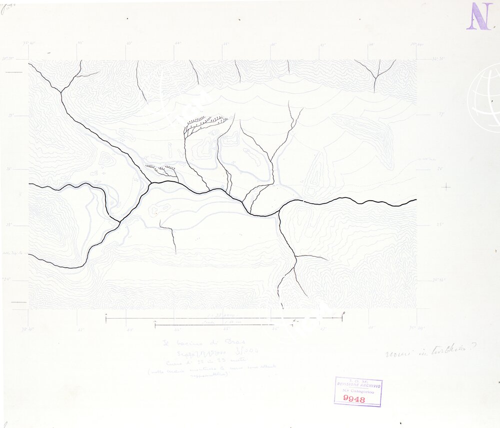 Originale disegnato a penna alla scala di 1:18.000 dell’ idrografia della carta del bacino di Dras alla scala di 1:30.000