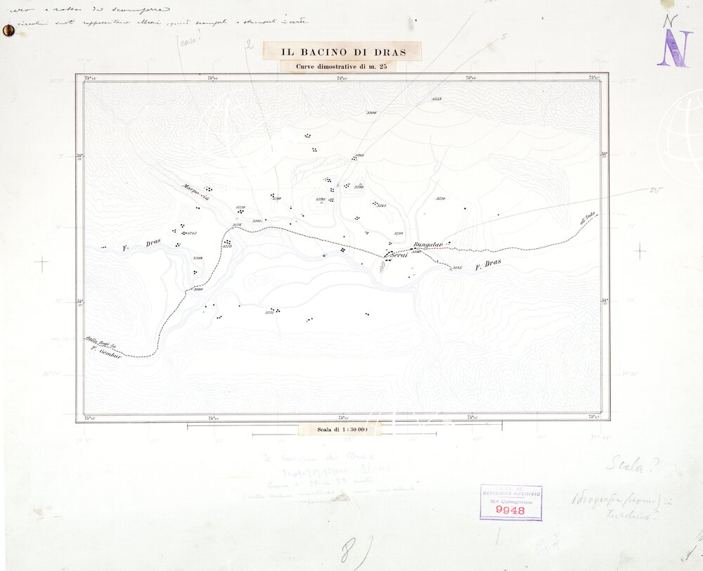 Originale disegnato a penna alla scala di 1:18.000 della planimetria e toponomastica della carta del bacino di Dras alla scala di 1:30.000