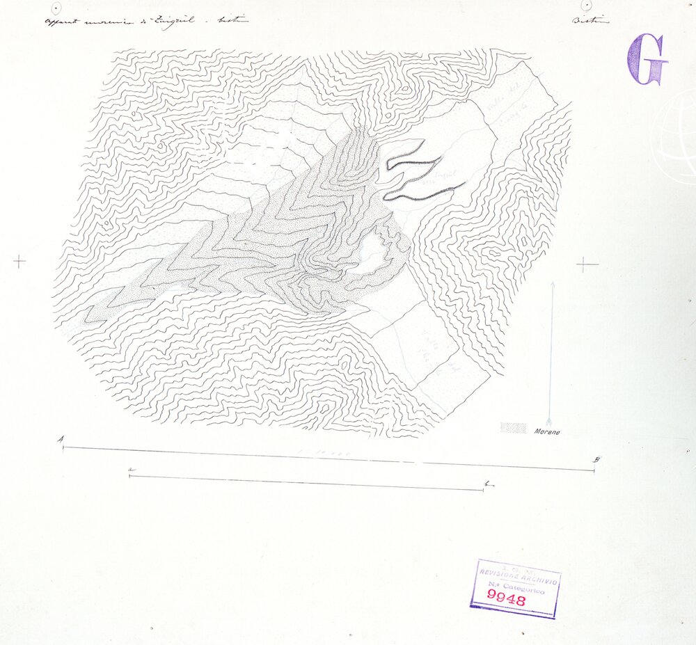 Originale disegnato a penna alla scala di 1:10.000 dell’ orografia della carta dell’ apparato morenico di Zingrul alla scala di 1:15.000