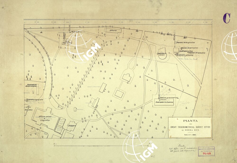 Originale disegnato a penna alla scala di 1:1440 della pianta degli uffici per la misurazione della rete trigonometrica di Dehra Dun.