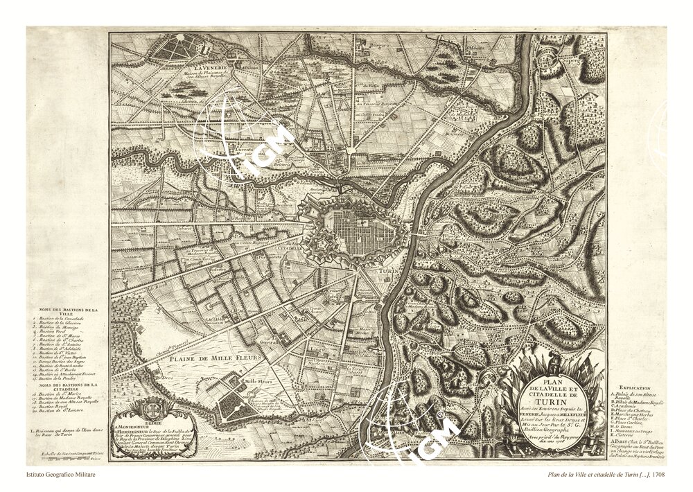 PLAN DE LA VILLE ET CITADELLE DE TURIN AVEC SES ENVIRONS DEPUIS LA VENERIE JUSQUES A MILLEFLEURS LEVEE SUR LES LIEUX DRESSE ET MIS AU JOUR PAR LE S.R.G. BAITTIEN GEOGRAPHE AVEC PIVIL DU ROY POUR DIX ANS 1708.