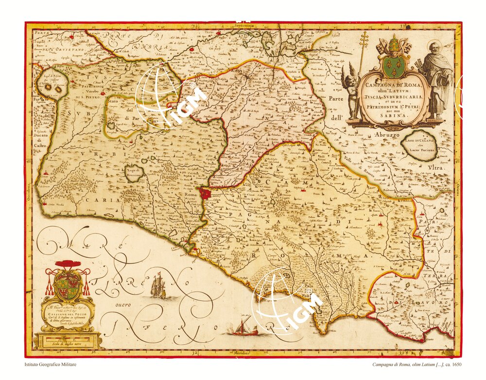 Incisione su rame in foglio unico. Carta dedicata a Cassiano del Pozzo (m. 1657) da Cornelio di Guglielmo Bleau. Orografia prospettica a monticelli. Abitati principali rappresentati schematicamente in pianta e riempiti in rosso: gli altri con torri e case. Sono indicate le zone boschive a mezzo di alberelli. Territori e confini statali a colori. FILE: B0008261