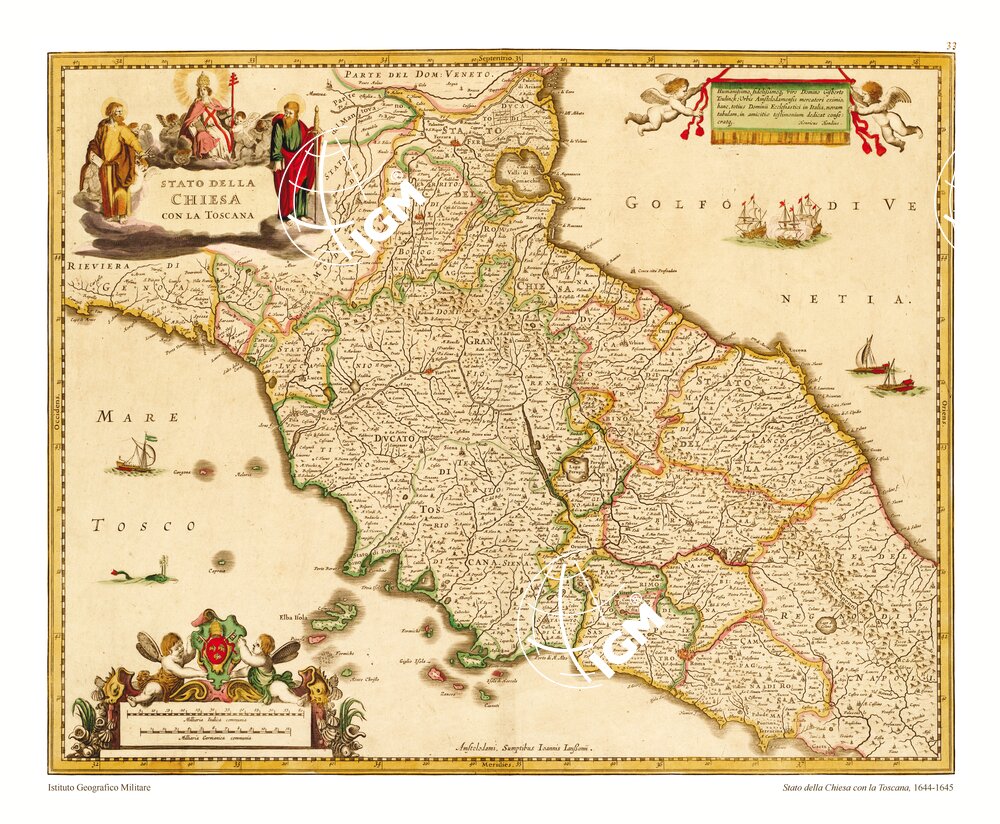 Incisione su rame in foglio unico. Carta dedicata da Henricus Hondius a Gilberto Teulink di Amsterdam. Orientazione normale. Longitudini riferite all’Isola di Capo Verde. Orografia prospettica a monticelli. Abitati rappresentati schematicamente in prospettiva. Confini a colori. Limiti: nord, Mantova; sud, Gaeta; est, Golfo di Venezia e Pescara; ovest, Mare Tosco. FILE: B0008168