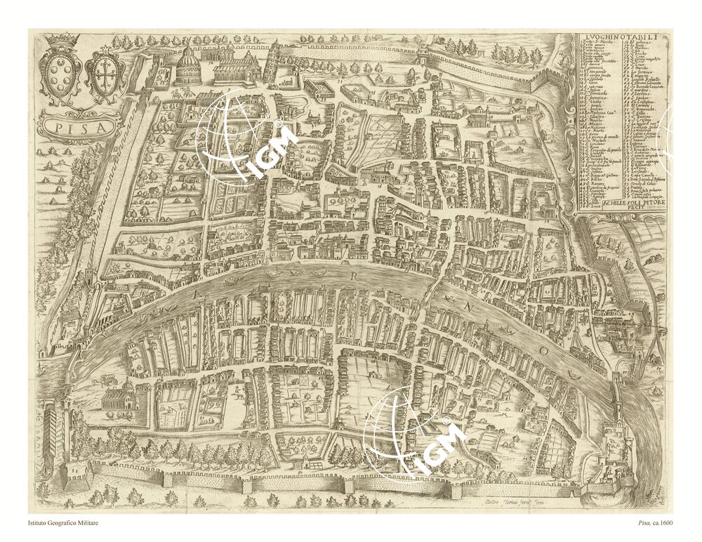 Pianta prospettica. A sinistra in alto gli stemmi dei Medici e della città. A destra l’ elenco numerico dei ” Luoghi notabili “. FILE: B0007169