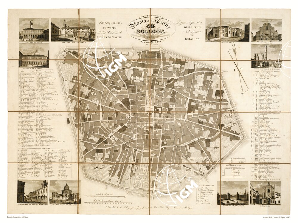 CARTE E STAMPE ANTICHE, COPIA IN PRONTA CONSEGNA DI ELEMENTO DI CARTOGRAFIA STORICA INSERITO NEL CATALOGO DEI PRODOTTI IN VENDITA A25; REALIZZATO DALL’ORIGINALE CONSERVATO PRESSO L’ISTITUTO GEOGRAFICO MILITARE.Un foglio stampato in nero montato su tela a stacchi. In alto sotto il titolo è la seguente dedica: “All’ E.mo R.mo Principe il Sig. cardinale Vincenzo Macchi legato apostolico della città e provincia di Bologna”. In basso è scritto: ” Presso Gio. Zecchi calcografo e tipografo sotto il portico della dogana vecchia in Bologna”. La pianta è sussidiata da elenco numerico delle principali costruzioni. Si distinguono a mezzo di segni, dei quali è data apposita legenda, gli stabilimenti dipendenti dal vescovado e quelli governativi, provinciali, comunali, particolari. Agli angoli vedute. Scala grafica in metri e pertiche bolognesi. FILE: B0002377