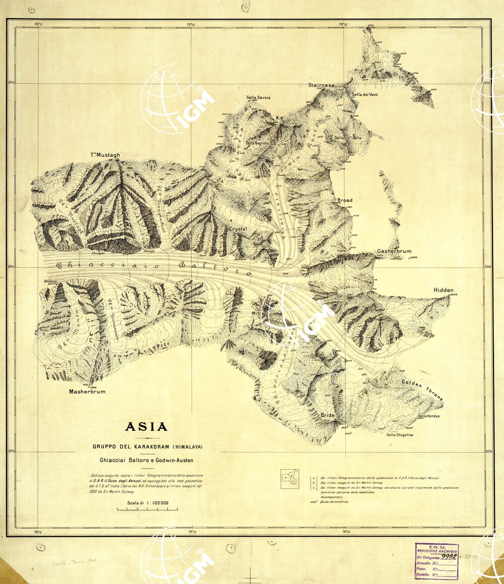 Schizzo eseguito sopra i rilievi fotogrammetrici della spedizione di S.A.R. il Duca degli Abruzzi e appoggiato alla rete geodetica del C.T.S. of India e ai rilievi eseguiti nel 1892 da Sir. Martin Conway. Originale disegnato a penna su cartone.