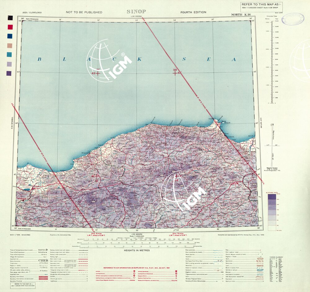 Carta del mondo del war office inglese. Proiezione Conica Policentrica. Rappresentazione orografica mediante ipsometria a tinte viola.