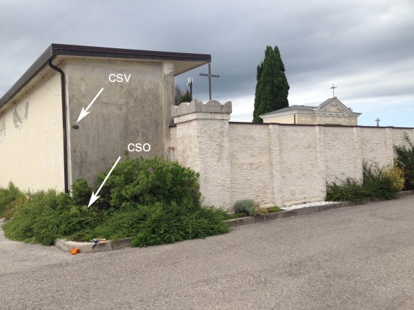 | Contrassegni | [{"simbolo_contrassegno":"B2","materializzazione":"(CSO) – Chiodo anonimo infisso sulla facciata laterale fronte strada dell'edificio dei loculi, in prossimit\u00e0 dello spigolo sinistro."},{"simbolo_contrassegno":"V6","materializzazione":"(CSV) – Piastrina Inox con cilindretto infissa sulla stessa facciata, in corrispondenza del CSO."}] |