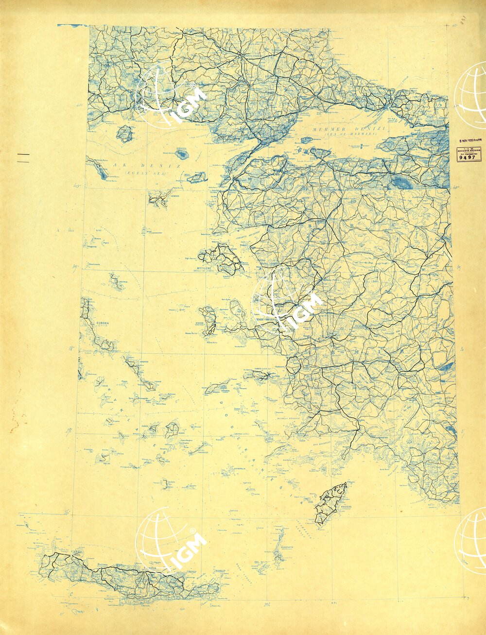 Carta realizzata dalla Divisione Cartografica dell’ IGM per conto del Ministero dell’ Aeronautica, gli originali sono disegnati su calco cianografico alla scala di 1:820.000