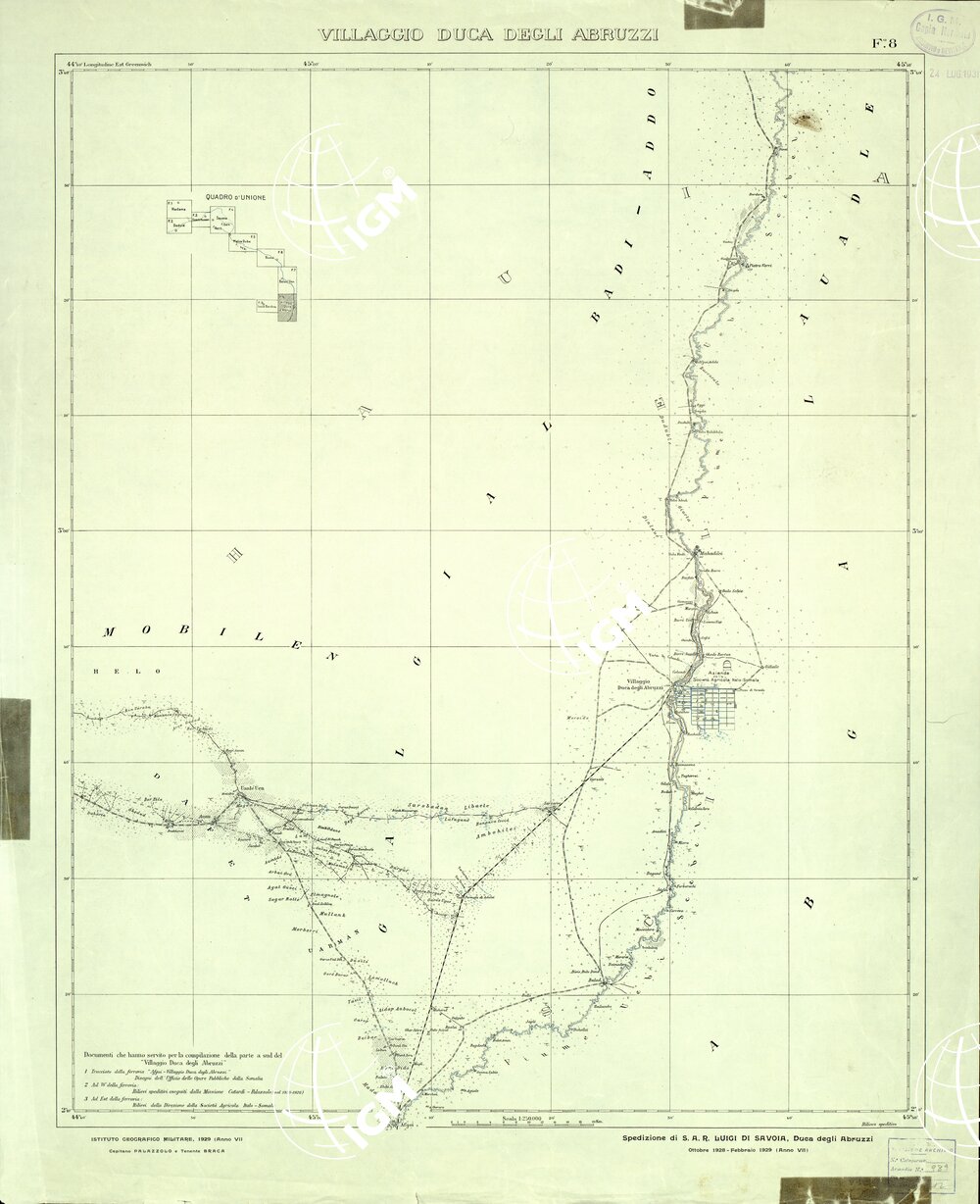 Carta in 9 fogli di dimensioni varie, i rilievi furono eseguiti dai topografi dell’ IGM al seguito della misssione esplorativa di S.A.R. il Duca degli Abruzzi dall’ Ottobre 1928 al Febbraio 1929, gli originali furono disegnati alla scala di 1:200.000 per la successiva riproduzione e pubblicazione alla scala di 1:250.000