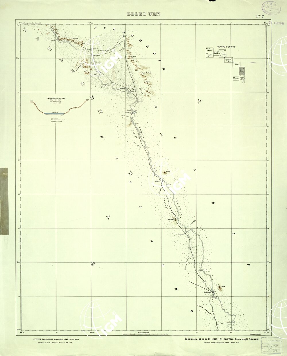 Carta in 9 fogli di dimensioni varie, i rilievi furono eseguiti dai topografi dell’ IGM al seguito della misssione esplorativa di S.A.R. il Duca degli Abruzzi dall’ Ottobre 1928 al Febbraio 1929, gli originali furono disegnati alla scala di 1:200.000 per la successiva riproduzione e pubblicazione alla scala di 1:250.000