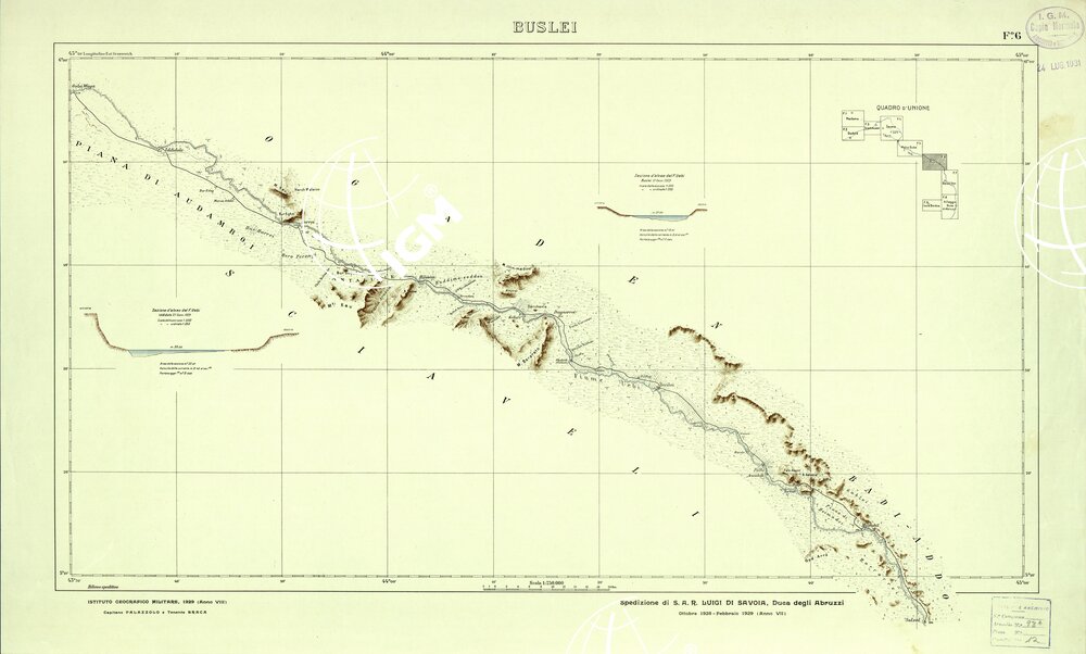 Carta in 9 fogli di dimensioni varie, i rilievi furono eseguiti dai topografi dell’ IGM al seguito della misssione esplorativa di S.A.R. il Duca degli Abruzzi dall’ Ottobre 1928 al Febbraio 1929, gli originali furono disegnati alla scala di 1:200.000 per la successiva riproduzione e pubblicazione alla scala di 1:250.000