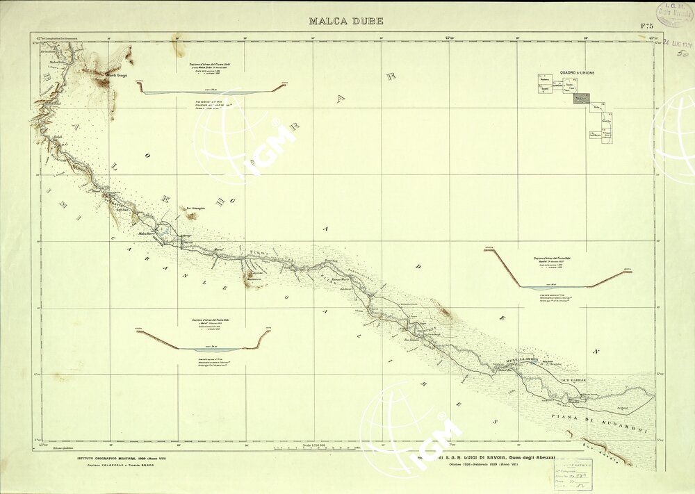 Carta in 9 fogli di dimensioni varie, i rilievi furono eseguiti dai topografi dell’ IGM al seguito della misssione esplorativa di S.A.R. il Duca degli Abruzzi dall’ Ottobre 1928 al Febbraio 1929, gli originali furono disegnati alla scala di 1:200.000 per la successiva riproduzione e pubblicazione alla scala di 1:250.000