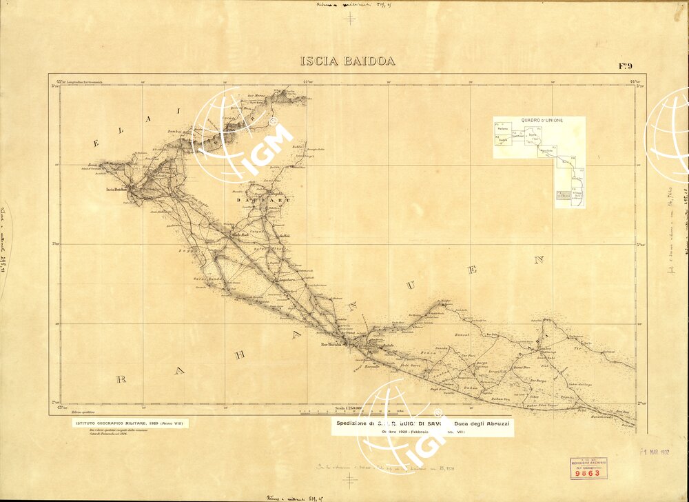 Carta in 9 fogli di dimensioni varie, i rilievi furono eseguiti dai topografi dell’ IGM al seguito della misssione esplorativa di S.A.R. il Duca degli Abruzzi dall’ Ottobre 1928 al Febbraio 1929, gli originali furono disegnati alla scala di 1:200.000 per la successiva riproduzione e pubblicazione alla scala di 1:250.000