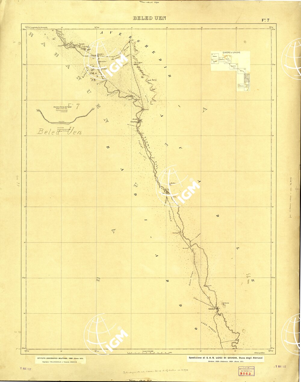 Carta in 9 fogli di dimensioni varie, i rilievi furono eseguiti dai topografi dell’ IGM al seguito della misssione esplorativa di S.A.R. il Duca degli Abruzzi dall’ Ottobre 1928 al Febbraio 1929, gli originali furono disegnati alla scala di 1:200.000 per la successiva riproduzione e pubblicazione alla scala di 1:250.000