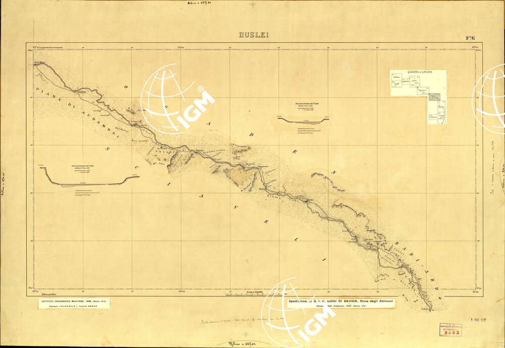 Carta in 9 fogli di dimensioni varie, i rilievi furono eseguiti dai topografi dell’ IGM al seguito della misssione esplorativa di S.A.R. il Duca degli Abruzzi dall’ Ottobre 1928 al Febbraio 1929, gli originali furono disegnati alla scala di 1:200.000 per la successiva riproduzione e pubblicazione alla scala di 1:250.000