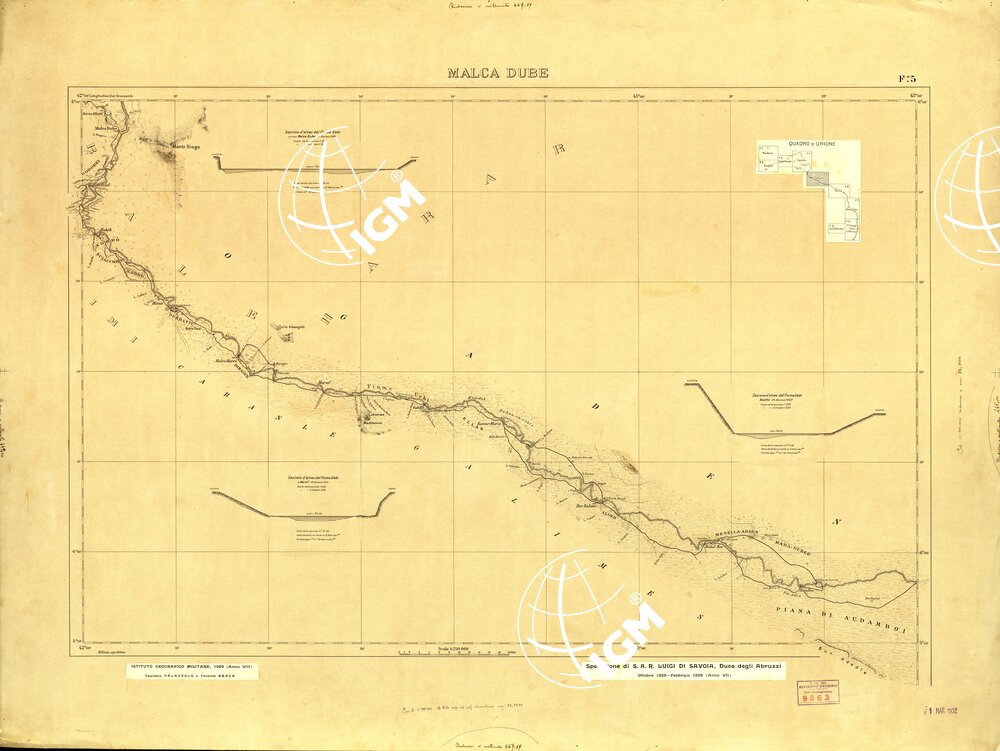 Carta in 9 fogli di dimensioni varie, i rilievi furono eseguiti dai topografi dell’ IGM al seguito della misssione esplorativa di S.A.R. il Duca degli Abruzzi dall’ Ottobre 1928 al Febbraio 1929, gli originali furono disegnati alla scala di 1:200.000 per la successiva riproduzione e pubblicazione alla scala di 1:250.000