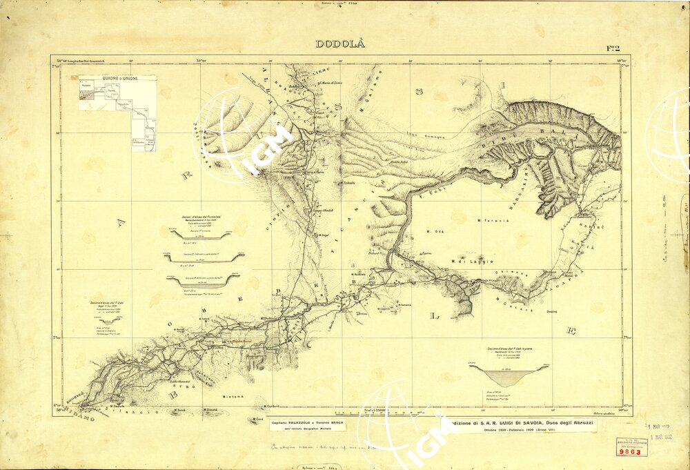 Carta in 9 fogli di dimensioni varie, i rilievi furono eseguiti dai topografi dell’ IGM al seguito della misssione esplorativa di S.A.R. il Duca degli Abruzzi dall’ Ottobre 1928 al Febbraio 1929, gli originali furono disegnati alla scala di 1:200.000 per la successiva riproduzione e pubblicazione alla scala di 1:250.000